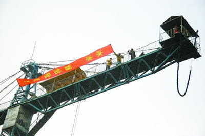 小樊這時站在了鐵架頂端,工作人員將其腰間用保險鎖固定好,一切準備就緒,一大紅條幅打了出來,上寫:冰冰,嫁給我吧!