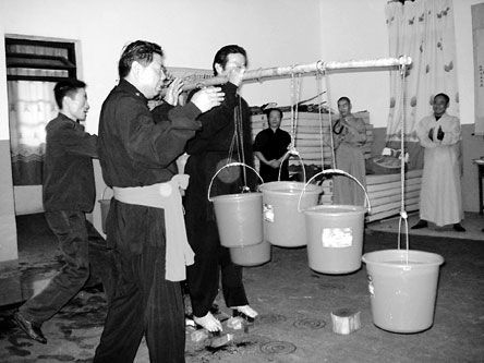 陳師傅說,除了踏刀提水外,他還有金剛腿、金槍刺喉等絕活!斑@些功夫源自少林。運功后,身體的肌肉會變硬,可抵擋銳器!彼f,最先練踏刀提水時,是嘗試性地站在刀刃上,當(dāng)時腳也會被割傷。隨著時間推移,腳皮越練越厚,在刀刃上堅持的時間也越來越長。