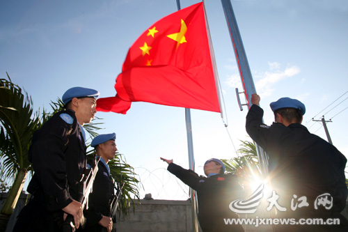 在維和期間,張偉保除了擔(dān)任防暴隊(duì)一分隊(duì)指導(dǎo)員,而且還是國(guó)旗手。今年2月1日,防暴隊(duì)去北京學(xué)習(xí)時(shí),觀摩了國(guó)旗護(hù)衛(wèi)隊(duì)升國(guó)旗的全過(guò)程,之后有幸將2月1日在天安門(mén)升起的國(guó)旗帶到海地。在防暴隊(duì)擔(dān)任國(guó)旗手的張偉保,在每個(gè)月的第一天以及國(guó)內(nèi)的重要節(jié)日里,他都要和兩名護(hù)旗兵一起,將中國(guó)國(guó)旗升起在海地的藍(lán)天下。“第一次將國(guó)旗在海地升起時(shí),心里有種說(shuō)不出的激動(dòng)!睆垈ケUf(shuō)。