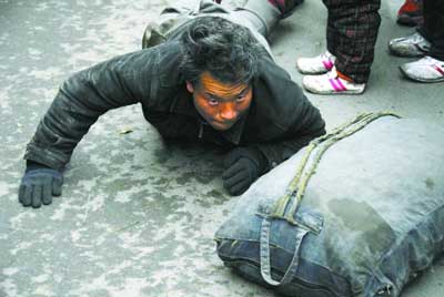 昨日下午3時(shí)許,張先生反映,一“精神正!钡拿窆ぴ卩嵵菔袞|三馬路上爬行,且已爬行了幾百米。而蹊蹺的是,民工竟拒絕幫助,連路人給錢(qián)都不要。