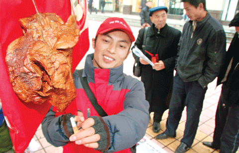 12月27日,長沙市黃興南路步行街,張好記舉著禁煙宣傳牌,不時用點燃的香煙去熏掛在宣傳牌上又干又黑的豬肺實習(xí)生龔磊攝本報12月27日訊“希望這個被熏黑的豬肺能給‘煙民’敲響警鐘,讓他們滅掉手中的香煙!苯裉焐衔,長沙市黃興南路,來自瀏陽的張好記舉著禁煙宣傳牌,不時用點燃的香煙去熏掛在宣傳牌上又干又黑的豬肺。