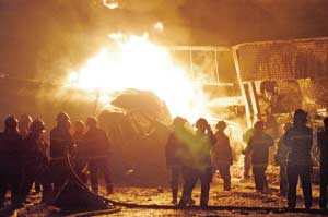 一名村民介紹說(shuō),昨晚9點(diǎn)30分左右,他正在村北一浴室洗澡,突然聽(tīng)到砰砰砰三聲爆炸聲,打開(kāi)浴室窗子一看,20米外的馬路上,兩輛大車(chē)“咬”在了一起,瞬間火就著起來(lái)了。