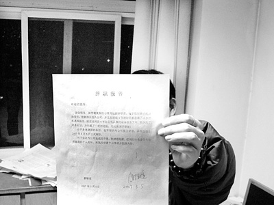 在左右權(quán)衡后,唐德連自知無法繼續(xù)勝任其工作,在2007年3月5日時(shí),他以身體虛弱為由,向他的部門領(lǐng)導(dǎo)北石廠總工程師鄒連陽(yáng)遞交了書面辭職報(bào)告。當(dāng)天,北石廠廠長(zhǎng)劉廣華把唐德連叫去談話,北石廠的意見是“不同意辭職”,但唐德連堅(jiān)持以“身體支持不住”為由辭職。然后,唐德連將IBM電腦等公司物品交還,由職工單翠霞簽字確認(rèn),他隨即離開崗位。
