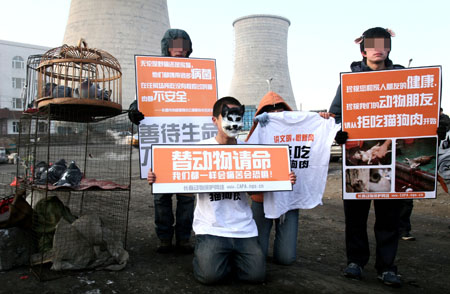 一名大學(xué)生穿著短袖,頭上戴著“貓咪”面具,身前放著一個(gè)“替動(dòng)物請(qǐng)命”的牌子跪在馬路上,一個(gè)女孩舉著印有“拒吃貓狗肉”的T恤衫跪在他旁邊。他們身后,幾名學(xué)生拿著“善待生命、刀下留情”的廣告牌陪同,學(xué)生們?cè)谏暮L(fēng)中“為動(dòng)物請(qǐng)命”,這是昨日發(fā)生在鴿子市場(chǎng)的一幕。他們希望用這種方式感染那些虐殺動(dòng)物的商販,讓商販們放下“屠刀”、珍愛生命。