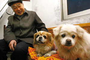 黃平指著一條黃色的京巴狗說:“它叫點點。”“點點”穿著花毛衣,肚子幾乎貼地,好動的它總是圍著主人轉,時而作揖,時而又咬一下旁邊的“多多”。“多多”是一條白色的藏黃犬,是黃平專門從康定買回來的,很忠心!岸喽唷斌w型偏胖,性格溫馴,整個采訪過程中,它始終坐在黃平身旁,睜眼望著主人。