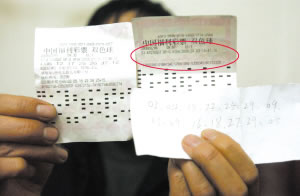 “因?yàn)椴幌胱尣势薄稓狻,我拿了彩票和自己手寫的?hào)碼便條,急急裝到了口袋內(nèi)就走了。第二天,我看到報(bào)紙公布的中獎(jiǎng)號(hào)碼,拿出手寫便條上的號(hào)碼一看,其中一個(gè)號(hào)碼就是500萬的中獎(jiǎng)號(hào)碼,可拿出彩票卻發(fā)現(xiàn)竟然沒有號(hào)碼。我要為我這500萬元討個(gè)說法!弊蛉丈衔,張先生拿著他手寫的選碼和空白彩票,來到本報(bào)投訴。