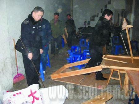 在市民們議論聲中,派出所的一輛長安面包警車隨之而到。警察打開車門下車時(shí),周圍那些剛剛從賭場走出來的人一半幸災(zāi)樂禍,一半認(rèn)真地說:“來晚了,門都關(guān)了!币?yàn)槲覀冊缫寻奄場的具體位置在電話中告知了警方,警方直接就走到賭場門口強(qiáng)行把卷簾門拉上去,進(jìn)去后就直接對賭博的道具進(jìn)行毀滅性破壞。幾分鐘后,兩個(gè)賭場的賭臺、凳子、電線等物全部被摧毀。其中一名警察得知記者的身份后,無奈地?cái)傞_雙手:“我們這段時(shí)間幾乎每天都要來,但每次到了這里,人都沒了,也看不到賭資。于是我們只好砸爛他們的賭博工具。等我們一走,他們一會兒又要開張,F(xiàn)在我們砸得手都軟了!”