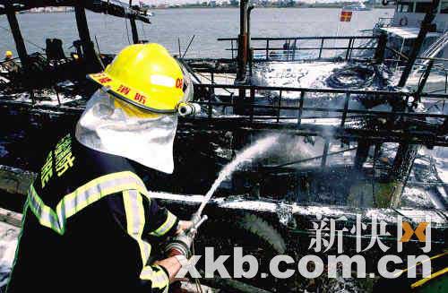 據(jù)了解,起火漁船為粵番禺01022號,596匹馬力,載重142噸,船主郭旺娣是石樓鎮(zhèn)群星村人,于前日出海回到蓮花山漁港碼頭!斑@艘船上裝有7噸柴油。”一消防員介紹,他們趕到時該船正順著流水由北往南漂!八敃r是邊燒邊漂,船上一片火海,連桅桿那么高的地方都燒起來了!