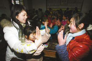 晚6時,東洲春蕾希望小學(xué)。住校的孩子們都已吃過晚飯,但停了一天的電依然沒來。一陣哨子聲響過,同學(xué)們又回到教室。一年級2班,數(shù)學(xué)老師姚川杰正和孩子們做游戲,教大家拍手和跺腳取暖!叭绻械娇鞓纺憔团呐氖郑 备蠋煹墓(jié)奏,孩子們的巴掌聲響成一片。