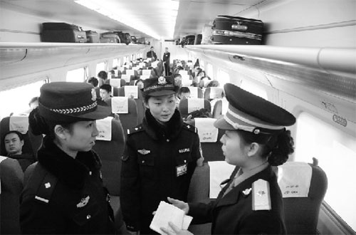 李鶴說,從1月3日起,就有6名女警登上了部分動(dòng)車組進(jìn)行了實(shí)驗(yàn),旅客們普遍感覺眼前一亮。當(dāng)好動(dòng)車組乘警不容易,每周她們都要接受嚴(yán)格的培訓(xùn),包括服務(wù)禮儀、警容風(fēng)紀(jì)、處置突發(fā)事件等,還被派往沈陽桃仙國際機(jī)場(chǎng)學(xué)習(xí)空中保衛(wèi)。英語測(cè)試、日常對(duì)話也必須過關(guān)。