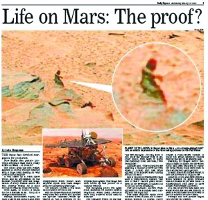 這張令人驚訝的火星照片顯示,在紅色星球的一處山坡上,一個腦袋碩大、如同“大腳怪”的黑色身影正揮著手臂走下火星山坡,它看起來又像是正坐在一塊石頭上休憩,還有人稱,照片上的“火星人”看起來像是一名女性。針對這幅“火星人”照片,英國《每日郵報》幽默地評論說:“她坐在一塊巖石上,像在等一輛公共汽車,不過如果真是這樣的話,她可能得面臨永無止境的漫長等待。”《泰晤士報》則將這個“火星人”比喻成是藏得無影無蹤的本·拉丹:“它是一塊巖石,還是火星光線的錯覺?或者是本·拉丹在遠離地球3億英里遠的荒蕪藏身處朝地球揮手?”