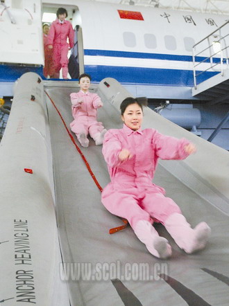 緊急撤離訓(xùn)練廳。廣播中傳出急促的警報(bào)聲,教員發(fā)出“緊急撤離”指令,此刻模擬艙內(nèi)濃煙彌漫,學(xué)員們立即行動(dòng)起來(lái),打開充氣滑梯,然后抬起雙手,將身體彎成90度直角跳出機(jī)艙,從滑梯上滑下。充氣滑梯大約有四層樓高,跳下去對(duì)一些膽小的人來(lái)說(shuō)是需要勇氣的。楊麗忘不了自己剛開始的狀況。20歲的楊麗身材高挑,面容清秀,從小嬌生慣養(yǎng),是爹媽的掌上明珠。那天楊麗聽到老師發(fā)出“一、二、跳”的指令,雙腿軟了,眼淚奪眶而出,持續(xù)了三分鐘。老師大聲吼道:“楊麗,快跳!”面對(duì)四層樓高的滑梯和嚴(yán)厲的訓(xùn)斥,楊麗越發(fā)害怕起來(lái)?拗鴳┣罄蠋煟骸澳懿荒懿惶,我害怕……”沒等楊麗說(shuō)完,老師便將她甩下機(jī)艙,這時(shí)楊麗雙手緊緊抓住艙門旁邊的鋼管,雙腳懸在滑梯上拼命地掙扎,大喊:“救命啊,救命!”現(xiàn)在她完全適應(yīng)了。