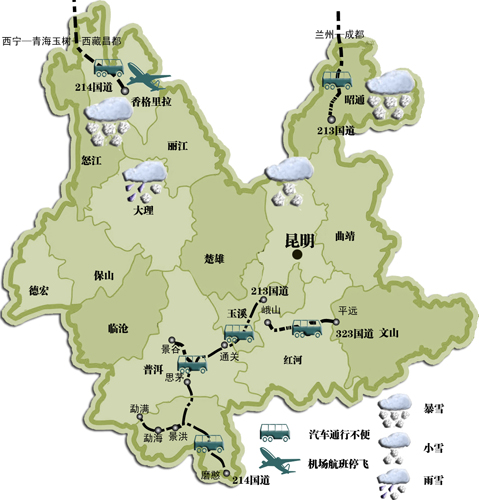 昨天下午6點(diǎn),云南省氣象臺(tái)發(fā)出了大雪結(jié)冰預(yù)警,預(yù)計(jì)從30日晚上8點(diǎn)至31日上午8點(diǎn),由于冷空氣向南擴(kuò)散,滇西北地區(qū)仍有中到大雪,局部地區(qū)暴雪;滇中以東地區(qū)有小雪和冰凍天氣。據(jù)氣象臺(tái)觀測(cè)到的數(shù)據(jù)顯示:昨天上午開始,停留在昭通和迪慶的冷空氣突然向南移動(dòng),天氣剛剛有所好轉(zhuǎn)的昭通又開始飄雪,曲靖的宣威、沾益、會(huì)澤一帶氣溫急劇降低10度左右,昨天下午氣溫降到零下3度,今天部分地區(qū)可能出現(xiàn)短時(shí)雨雪;滇西北的迪慶香格里拉昨天依舊大雪紛飛,這一區(qū)域的冷空氣也開始向大理、麗江蔓延,昨天,大理的洱源縣也下起了雨雪。