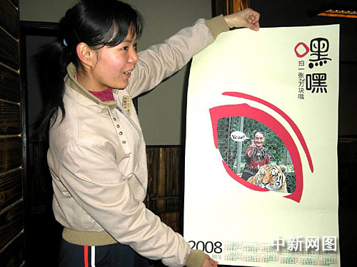 記者看到,網(wǎng)友“小二黑”的“周老虎年畫”作品非常簡(jiǎn)潔、有趣,頗具幽默和滿諷刺。年畫左上角寫著“黑嘿,拍一張2萬(wàn)元”,中間是身材瘦小、眉開眼笑的周正龍騎在一只老虎背上,揮手致意,下面是2008年的日歷。