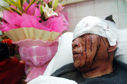 在爆炸中同樣驚魂的還有朱昆峽和老伴阮群。病床上,56歲的朱昆峽頭纏著厚厚的紗布,面部被高溫燙傷,紅腫發(fā)亮!拔覀冊缟蟿偝鲩T去給大娘過生,他在前面我走在后面。”阮群說,當(dāng)他們走到14號時,突然發(fā)生了煤氣爆炸,老伴朱昆峽頓時便不見了人影。阮群說,在慌亂的人群中突然發(fā)現(xiàn)一個滿臉是血、雙手抱著頭的人,“我說這個老頭咋沒人管喃,便趕緊上前去攙扶,才發(fā)現(xiàn)居然是自己老伴!比钊赫f,爆炸來得太突然了,很多人根本來不及躲藏就被爆炸產(chǎn)生的高溫和熱浪擊翻在地,受傷者中許多人血流滿面,有的被玻璃擊中頭部和眼睛。