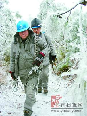 嚴重冰凍災(zāi)害天氣讓曲靖很多地方的電網(wǎng)面臨嚴峻考驗。沾益縣的冰凍尤為嚴重,轄區(qū)電力設(shè)施損壞十分嚴重。在電力抗災(zāi)搶險現(xiàn)場,記者看到厚厚的覆冰把電線壓塌,有些電桿被攔腰折斷。