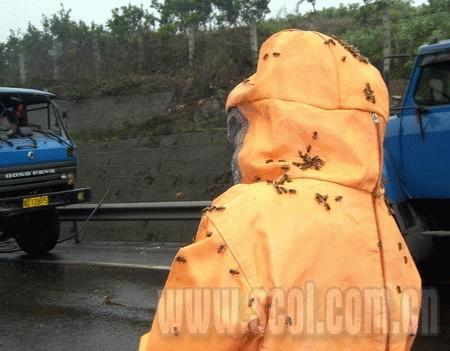 事故現(xiàn)場,一名中年男子臉色鐵青,一言不發(fā)地盯著滿天飛舞的蜜蜂發(fā)愣。他就是大貨車司機(jī)劉強(qiáng)!3天前,云南養(yǎng)蜂專業(yè)戶厲煥平一行4人,租用我的車幫他們把蜜蜂從昆明運(yùn)往德陽放養(yǎng)!弊蛉丈衔7時(shí),當(dāng)他開車行至成渝高速資中段時(shí),突然感覺方向盤不穩(wěn),大貨車發(fā)生劇烈抖動(dòng)。突然聽到坐在駕駛室的厲老板說,后面有個(gè)車輪快跑脫了。厲老板話還沒說完,貨車一陣劇烈的抖動(dòng),來了個(gè)原地180度調(diào)頭,“轟”一聲側(cè)翻于公路上。等他們下車一看,整個(gè)后右輪竟飛到了幾十米開外,大家當(dāng)場嚇懵了。車上裝載的蜂箱撒落在地上,霎時(shí)間,蜂箱內(nèi)成群結(jié)隊(duì)的蜜蜂鋪天蓋地地飛了出來。劫后余生的蜜蜂老板厲煥平,望著滿天亂飛、遍地蜂尸的場面,心痛得不得了:“這批蜜蜂沒買保險(xiǎn),哪個(gè)賠我的損失喲!”(作者: 楊元祿 高冰潔)