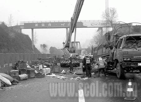 “成渝高速資中段出車禍了,鋪天蓋地的蜜蜂滿天飛,好嚇人喲!”昨日上午10時(shí),記者驅(qū)車前往資中。當(dāng)車行至成渝高速148公里處時(shí),被前方長長的車龍堵得無法動(dòng)彈。直至12時(shí)10分,記者才挪到事發(fā)地點(diǎn)。離事發(fā)地點(diǎn)500米處,高速路變成單行道。事故現(xiàn)場,一輛車牌號(hào)為川D12695的加長大貨車,已被吊至超車道上。幾名頭戴防蜂帽的工作人員正忙于將貨車拖離現(xiàn)場?砍嚨酪环降孛嫔,堆了數(shù)十個(gè)被撞壞了的蜜蜂箱。高速路上空,全是密密麻麻滿天飛舞的蜜蜂群,“嗡嗡”之聲不絕于耳。地面上,躺著至少數(shù)十萬只蜜蜂的尸體。