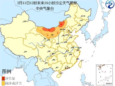 中新網(wǎng)3月11日電 中央氣象臺今天上午十時(shí)繼續(xù)發(fā)布沙塵天氣預(yù)報(bào):受東移冷空氣影響,預(yù)計(jì)今天中午到明天中午,甘肅河西走廊、內(nèi)蒙古中西部、寧夏北部、陜西北部等地有揚(yáng)沙或浮塵天氣,內(nèi)蒙古中西部偏北的部分地區(qū)有能見度小于1000米的沙塵暴。