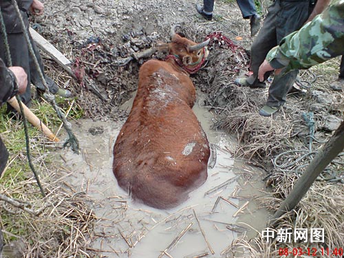 中新網(wǎng)杭州三月十三日電(記者 柴燕菲 實(shí)習(xí)生 汪恩民 通訊員 朱紅霞)昨天,浙江橫峰一頭千斤重的老黃牛陷進(jìn)泥潭險(xiǎn)些喪命,在當(dāng)?shù)厝罕姷拇罹认,這頭老黃牛才撿回一條命。