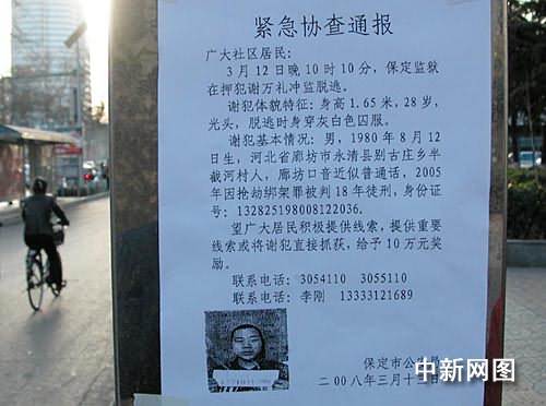 中新網(wǎng)保定3月13日電 (記者 呂子豪)今日,河北省保定市區(qū)遍布公安緊急協(xié)查通報(bào),通報(bào)稱(chēng),三月十二日晚十時(shí)十分,河北保定監(jiān)獄在押犯謝萬(wàn)禮沖監(jiān)脫逃。