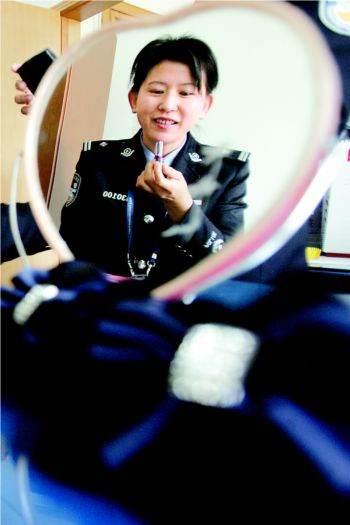 “警花”們上崗前都要統(tǒng)一化淡妝,頭花是經過認可的統(tǒng)一佩戴。