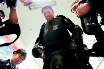 將30多斤的防暴服穿在身上不是件容易的事,需要隊員們的共同協作,而每周這樣的訓練不下三次。