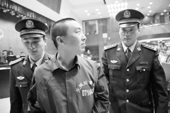 下午3時10分,待法庭書記員宣讀完法庭紀(jì)律后,宣判開始了。在三百多雙眼睛的注視下,在上百臺照相機(jī)、攝像機(jī)的聚焦下,許霆被法警押上了被告席。穿著天看(天河區(qū)看守所)1643號藍(lán)色看守服的許霆,臉上還是那么白,還是那么鎮(zhèn)定。法警解開手銬后,他端坐在法庭被告席上,雙手分開緊緊地貼在了膝蓋上。負(fù)責(zé)該案的審判長開始宣讀審判書,許霆始終目不轉(zhuǎn)睛地緊盯著他。
