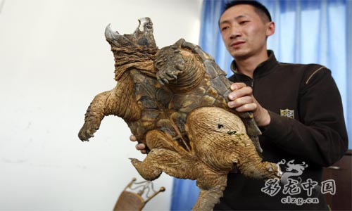 記者隨后從網(wǎng)上查找了一些相關(guān)的資料,發(fā)現(xiàn)這個(gè)“怪物”有點(diǎn)像麟角鱷龜!肮治铩本烤故遣皇谴篦{龜,還有待于專家的鑒定。