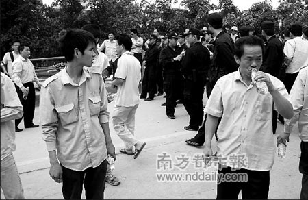 記者在現(xiàn)場看到,寶安區(qū)西鄉(xiāng)街道前進二路、寶田一路路邊停滿了“綠的”,數(shù)量至少在100輛以上,大批司機圍在鳳凰崗社區(qū)一處門崗,寶安民警、巡防隊員用身體排成警戒線,將司機們擋在門崗?fù)。門崗玻璃、飲水機被砸壞,一輛治安巡邏車反光鏡等處被砸毀。流塘派出所、西鄉(xiāng)街道辦有關(guān)人士正在做司機的思想工作。
