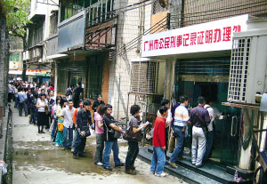 “真是奇觀!”昨日,倉邊路廣州市公民刑事記錄證明辦理處的狹窄小巷里,排滿了幾百名前來辦理無罪證明的廣交會客商。一些參展商排了4個小時還沒排到,紛紛發(fā)起牢騷。