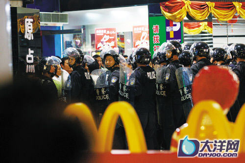 商場方面也關(guān)閉了電梯和所有出口,場面依然混亂,造成區(qū)域性交通堵塞。隨后,又有大批防暴警察和交警趕到。交警指揮交通,防暴警察開始疏散旁邊聚集的人群。