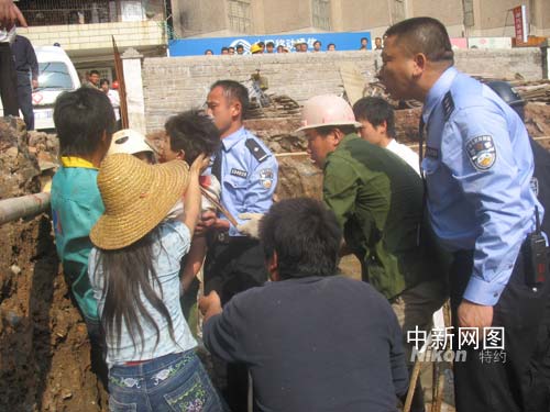 接到報(bào)警后,南雄市公安局巡警大隊(duì)陳本雄大隊(duì)長(zhǎng)帶領(lǐng)警員黃志明等火速趕到現(xiàn)場(chǎng)?紤]到使用電焊機(jī)切割會(huì)產(chǎn)生強(qiáng)烈的高溫及震動(dòng),對(duì)傷者不利,陳大隊(duì)長(zhǎng)果斷決定使用小鋼鋸鋸斷鋼筋。為爭(zhēng)取搶救時(shí)間,陳大隊(duì)長(zhǎng)一邊指揮工地其它工人協(xié)助民警黃志明用手托住胡某的手臂和頭部,一邊趴下身子鋸鋼筋。雖然鋼筋只有2.5厘米,平時(shí)鋸斷也只要兩分鐘,但陳大隊(duì)長(zhǎng)一秒鐘都不敢停留,生怕耽誤了搶救良機(jī)。鋼鋸片因耐不住快速摩擦產(chǎn)生的熱能,中途折斷了兩次,F(xiàn)場(chǎng)所有的人都屏住呼吸,緊張地看著眼前發(fā)生的一切,并默默地為傷者祈禱。直到換了第三把鋼鋸,鋼筋終于被成功鋸斷。緊接著,民警馬不停蹄地協(xié)助120醫(yī)生將傷者送往人民醫(yī)院搶救。