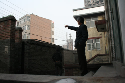 趙七明在一高一矮兩名法警的看護下,從通往廁所的法庭側門走出。下6級水泥臺階,再橫穿最底層臺階與廁所之間1.8米寬(本報記者4月14日測量所得數(shù)據(jù),下同)的一條巷道,就到了廁所門前。