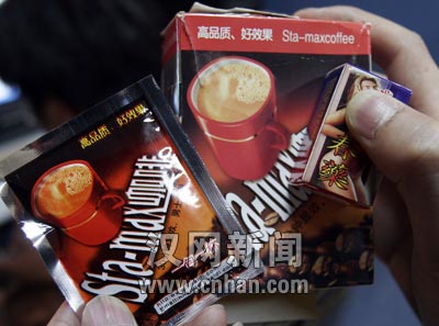 火鳳凰成人保健用品公司的貨架上還擺了一種催情咖啡,沒有廠名、廠址,方形外包裝與雀巢咖啡十分近似,每盒有8小袋。說明稱每袋催情咖啡對入150毫升開水沖泡,30分鐘見效。店員稱其口感與速溶咖啡類似,批發(fā)價(jià)每盒18元。