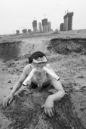 “這就是垃圾場(chǎng),我們生活的地球已經(jīng)被垃圾覆蓋,我們安睡的地點(diǎn)就在垃圾的包圍之中!痹诰嚯x宋莊鎮(zhèn)1公里遠(yuǎn)的一片空曠地,堆滿了各種垃圾廢料,在蚊蠅的環(huán)繞下,藝術(shù)家們抬來(lái)一張床,一名男子躺在床上,全身被白布包裹,上衣被人剪開后,一只鬧鐘被捆綁在左胸前,隨著鬧鐘秒針的跳動(dòng),生活在垃圾包圍中的他,生命也向“死亡”逐步靠近。