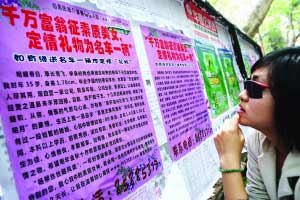 隨后,記者按照“征婚啟事”上所留的號碼,撥通了“征婚熱線”,原來這是南京心雨園婚介所的電話。這家婚介所的負責人宋先生告訴記者,這位“千萬富翁”高調(diào)征婚,委托他們在高校張貼征婚啟事,尋覓到他心目中的有緣人。他們已經(jīng)在南京大學和南師大張貼了海報,并發(fā)放了數(shù)百份廣告單。他透露,目前已經(jīng)有南大的研究生看到海報后主動和他們聯(lián)系了。