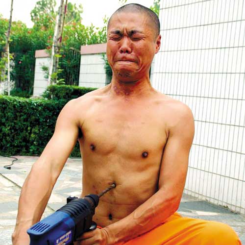 接著,胡瓊又表演沖擊鉆鉆人體。他先用通上電的沖擊鉆鉆木頭和花崗石。木石都被擊穿。然后,胡師傅把腰帶扎得更緊,扎馬下腰、氣沉丹田,大喝一聲,用雙手把高速運(yùn)轉(zhuǎn)的沖擊鉆鉆向肚皮。臺(tái)下觀眾們屏住呼吸,有人蒙住雙眼不敢看。咝咝作響的沖擊鉆在胡師傅的肚皮上打轉(zhuǎn)一分鐘后,胡師傅取下沖擊鉆,肚皮竟絲毫無損。隨后,胡師傅還表演了用沖擊鉆鉆太陽(yáng)穴。表演結(jié)束后,胡師傅告訴記者,他表演的電鉆鉆人體,就是民間傳說的“金鐘鐵布衫”功夫。