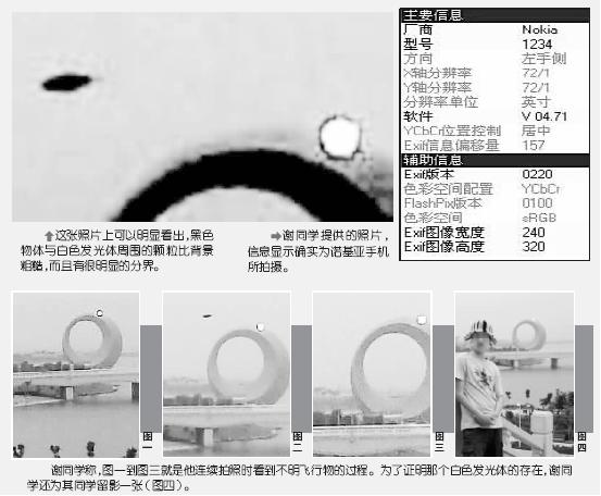 這幾張蹊蹺的照片中,有著不明飛行物的那張照片特別小,只有7萬(wàn)像素。記者讓PS高手小杜進(jìn)行鑒別,小杜把圖片放在photoshop里放大到1000%并加大反差,發(fā)現(xiàn)“不明飛行物”及旁邊的像素顆粒比背景粗糙,而那個(gè)很像太陽(yáng)的發(fā)光體也一樣,發(fā)光體周?chē)粋(gè)方塊以內(nèi)的顏色和整張圖明顯不一致。
