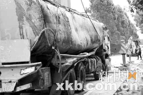 出事車輛所屬的運輸公司派來了一輛油罐車及搶修隊到事發(fā)地進行倒灌。由于硫酸罐車嚴重側(cè)翻,加上水泵壓力,該公司搶修隊經(jīng)過2個多小時的幾番嘗試后,仍未能實施倒灌救援。