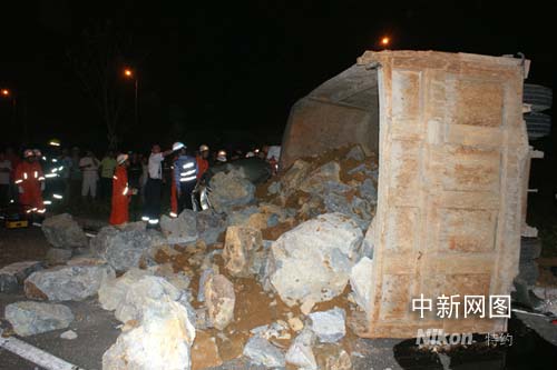 在事故現(xiàn)場(chǎng),記者看到一輛滿載石頭的工程車側(cè)翻壓在一輛面包車上,地面撒滿了玻璃碎片和石頭,面包車嚴(yán)重變形,2名人員被困,其中一名女子經(jīng)現(xiàn)場(chǎng)救護(hù)人員診斷稱由于失血過多已死亡,另一名被困人員被壓在了工程車下面,不能動(dòng)彈,生命垂危。
