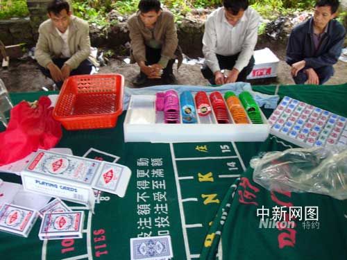 5月7日下午13時,廣東韶關(guān)仁化縣公安局治安大隊(duì)獲悉,三天前,一賭檔從湖南省汝城縣大坪鎮(zhèn)大麻溪村旁的野外遷到了仁化縣城口鎮(zhèn)圍坑村一山窩處,利用撲克牌以“百家樂”的形式開賭。