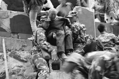 雨越下越大,很多戰(zhàn)士的迷彩服上全是泥水,已經(jīng)完全看不出顏色。幾個(gè)戰(zhàn)士抬著一名受傷的女孩,一路上不停地鼓勵(lì)著:“千萬(wàn)不要睡著了!”