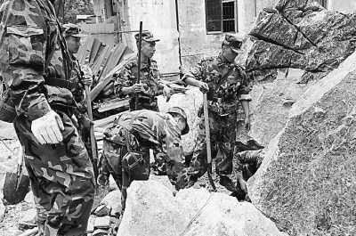 當(dāng)天凌晨,解放軍某部的2000余名官兵,一進(jìn)入綿陽(yáng)市北川縣城,就開(kāi)始了緊張的救災(zāi)工作。