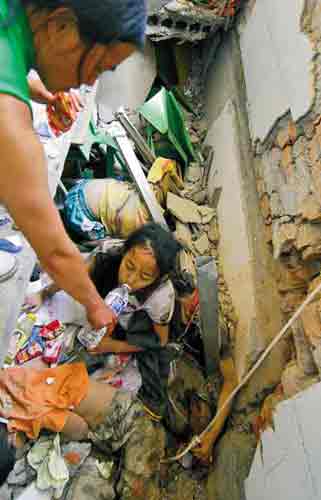 在這里,一名親見女兒身體卻拉不出來(lái)的母親在哭泣,記者見證了一個(gè)震撼人心的場(chǎng)面:一、二層間還存在一個(gè)不到一米的夾層,一名穿綠衣的高中女孩已經(jīng)爬出,返身去拉那名也已大半個(gè)身子爬了出來(lái)的那名母親的女兒,此時(shí)夾層房梁塌下來(lái),二名女孩保持著返身救人和伸手待救的姿態(tài),被砸在了主梁下面,她們離生其實(shí)只差半步之遙。