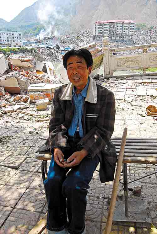 14日下午,當(dāng)所有救援人員撤退后,北川縣城的街道幾乎空無一人,周圍的廢墟里都是尸體,并靜得令人恐懼。然而,開了一輩子車才剛剛退休一年的周康龍,坐在河邊的凳子上,始終不肯離開。他身旁不遠(yuǎn)處的六樓,就是他的家,可現(xiàn)在有一半已在地震中倒塌了。