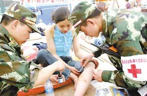 15日16時,廣東邊防六支隊醫(yī)療小分隊得知有4名被困學(xué)生急需救助后迅速趕往救援地點(diǎn)。有4名學(xué)生正通過亂石中的一條縫隙向外呼救,此時距離他們被困已超過75小時。被困4名學(xué)生被一一救出。廣東邊防六支隊官兵立即將他們抬上擔(dān)架送往戰(zhàn)地醫(yī)院救治。15日晚上,在地震發(fā)生80小時內(nèi),廣東邊防六支隊醫(yī)療小分隊在漢旺鎮(zhèn)東汽中學(xué)的廢墟中成功救出4名被困中學(xué)生。