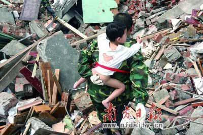 昨日下午5點(diǎn),記者第三次深入北川縣城核心現(xiàn)場(chǎng),發(fā)現(xiàn)一股從背后深山逃出的人流。他們的眼神充滿對(duì)親人的依戀,生怕再次分開。11歲的張吉萬(wàn)背著3歲半的妹妹張韓,非常吃力地走著。同行的爺爺、奶奶已經(jīng)老了,父母在外打工,小吉萬(wàn)就勇敢地?fù)?dān)負(fù)起小男子漢的責(zé)任。早上5點(diǎn)出發(fā),已經(jīng)走了12個(gè)小時(shí)了。小吉萬(wàn)說(shuō),他很愛妹妹。