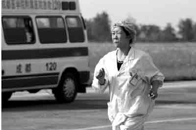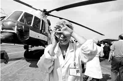 昨天下午4點(diǎn)05分,東方通用航空公司的一架米1-71直升機(jī)緩緩降落在廣漢機(jī)場(chǎng)停機(jī)坪上。艙門打開,40歲的女護(hù)士杜娟下了飛機(jī),招呼著成都120急救中心的醫(yī)護(hù)人員將傷員抬到急救車上。杜娟是北川縣禹里羌族鄉(xiāng)衛(wèi)生院的護(hù)士。5·12地震后,禹里與世隔絕,直到昨天才等到直升機(jī)將重傷者送出。杜娟隨機(jī)照顧患者。傷員都下了飛機(jī)后,杜娟向于波借手機(jī),電話打通時(shí),她手開始顫抖,撕心裂肺的哭聲終于無法忍住。那是她六天后,第一次給外面的親人打電話。巨大的螺旋槳轉(zhuǎn)動(dòng)聲中,人們只能依稀聽到她的哭訴:“我要去找他,不能連個(gè)尸體都沒有!庇诓乜粗坏揭粋(gè)小時(shí)前,他還覺得這個(gè)女護(hù)士嚴(yán)厲得有點(diǎn)過分。