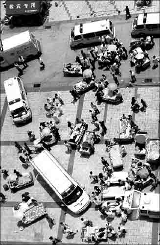 為了使傷員得到更好的治療和照顧,部分傷員將從綿陽(yáng)轉(zhuǎn)至重慶。從17日晚10時(shí)開(kāi)始,500多輛急救車(chē)開(kāi)始了轉(zhuǎn)移傷者的行動(dòng)。